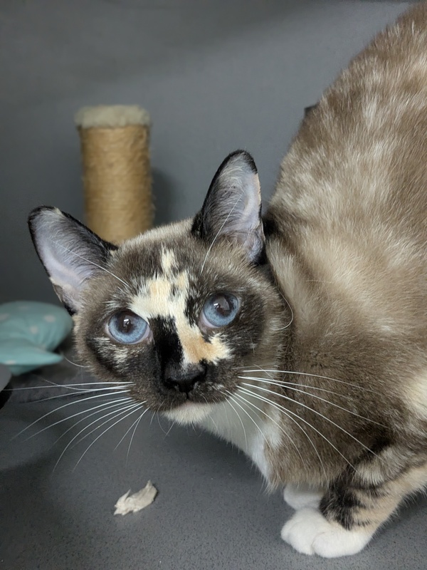 She's a gentle soul who can become overstimulated with too much petting or excitement, so it's important to watch her body language and give her space when needed. Playtime using toys (not hands) and regular enrichment, such as vertical spaces and structured play sessions, will help her feel confident and relaxed.