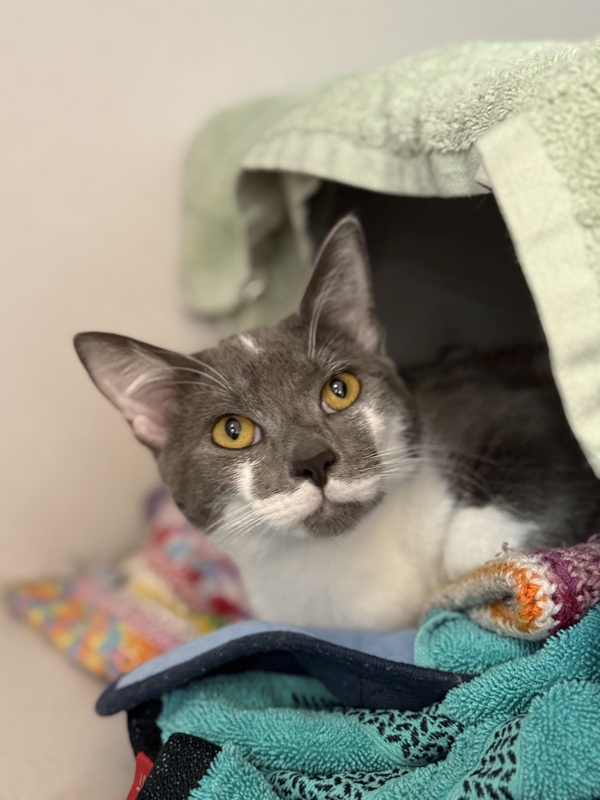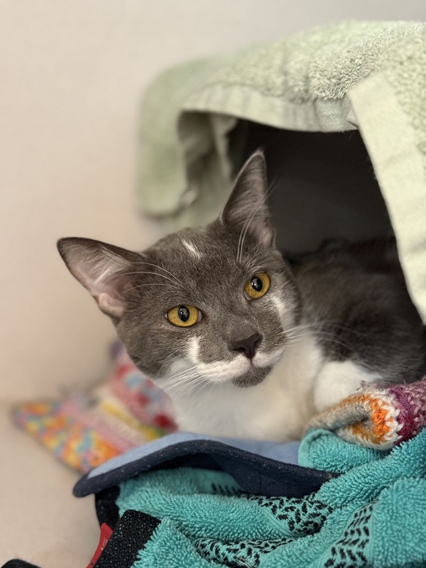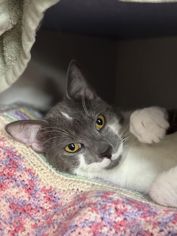 a brave boy with a gentle heart who's come a long way in a short time. Initially shy and shut down, Kendo has quickly warmed up and now greets visitors with bunts, leans into pats, and happily licks up treat paste. He's curious, affectionate, and eager to explore, especially when he's with his feline friend. With a calm environment and a little love, this sweet stray is ready to leave his past behind and start fresh in a forever home. If you're looking for a companion who's blossoming into his best self, Kendo is ready to meet you.