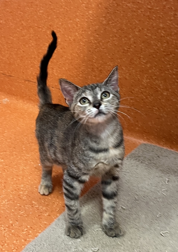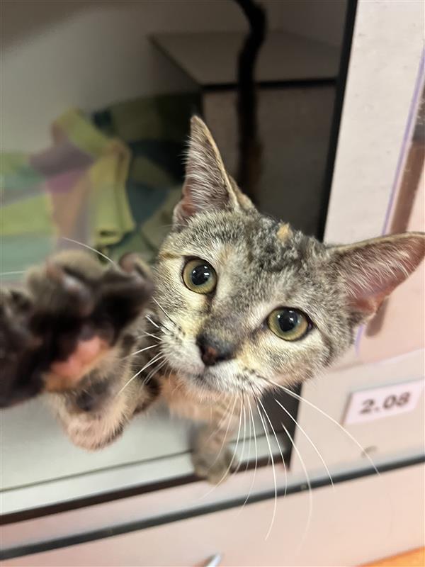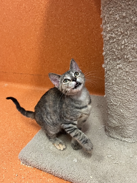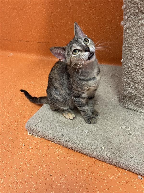 Meep is an adorable brown torbie kitten full of playful energy and quirky charm. She's curious, confident, and always ready to pounce on a toy or explore something new. Between her zoomies and kitten silliness, she loves a good cuddle and will happily curl up for pats.