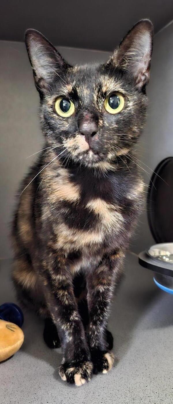 When you have a kitty-cat like Rizzo, everyday will be an amazing time sharing cuddles and affection with your girl. Rizzo has an extremely gentle and loving nature and you'll never feel alone in your home. Every time you look around, there she'll be, waiting for you. Her black tortoiseshell coat is silky soft and shows off her big yellow eyes. Rizzo will be your loving companion for many, many years. Recommendations for her care:-