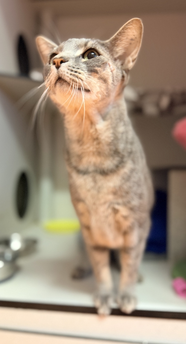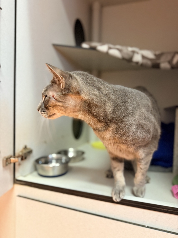 Bandit can be timid in new environments and will need to start in a small, quiet launch room before gradually exploring the rest of the house. Large open spaces can feel overwhelming, so giving them time, patience, and plenty of safe spaces (cat trees, scratch posts, boxes, shelves, and hides both high and low) will help their confidence grow.